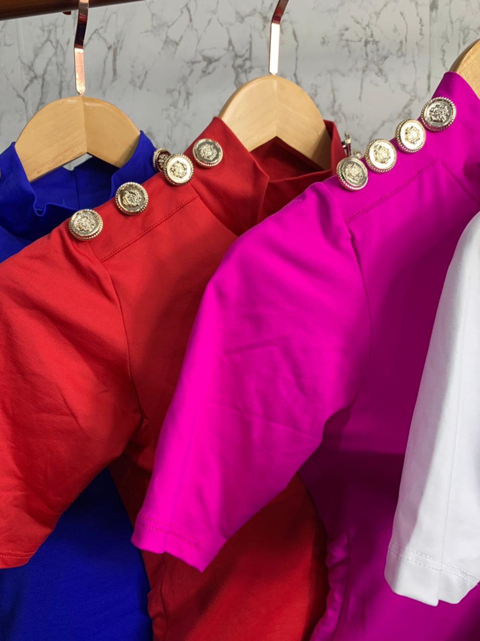 Modelo: Baby Look com gola alta e detalhes em botões dourados nos ombros
